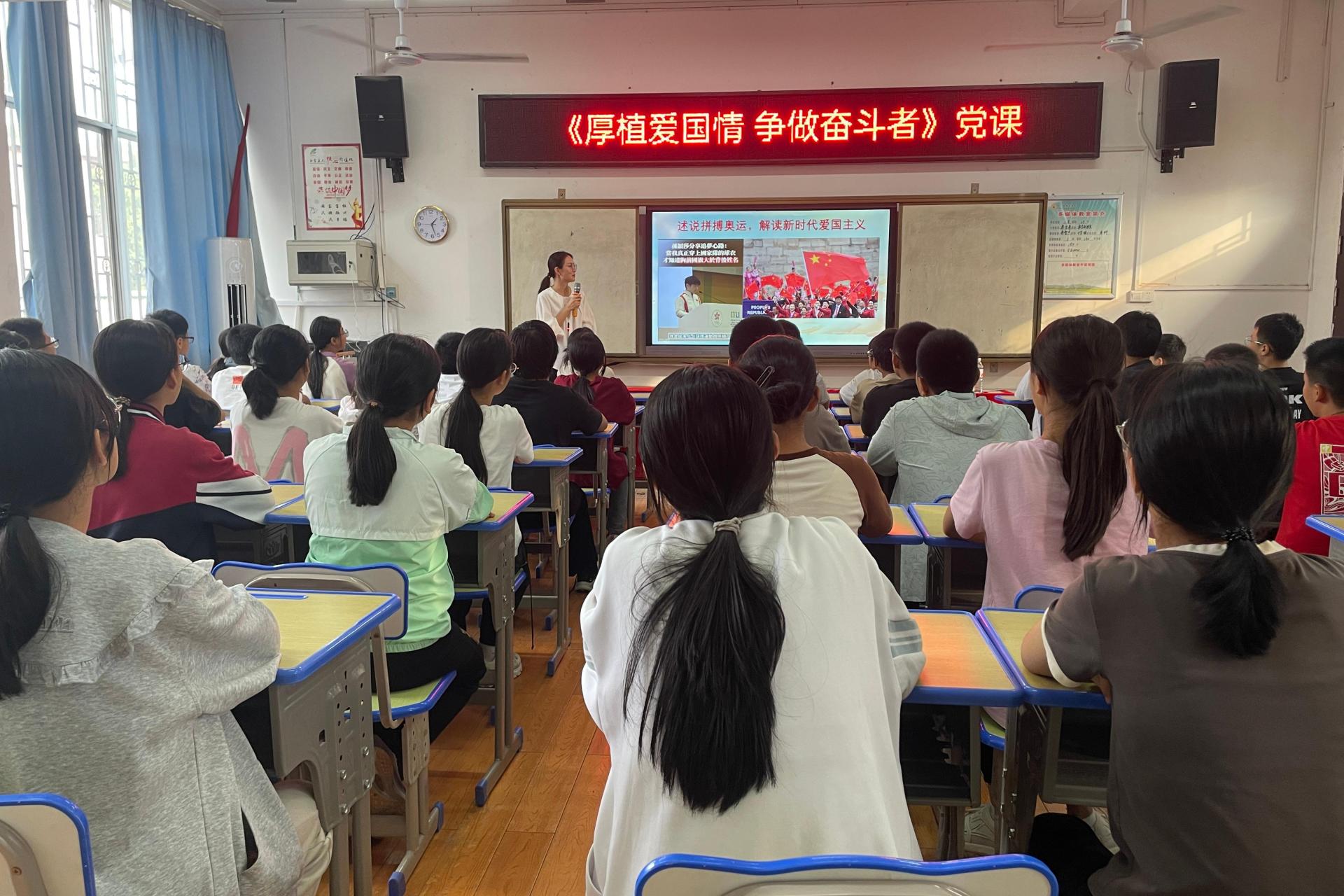 党课伊始,学校马克思主义学院何成琳老师以三个深刻的问题拉开帷幕:“你是中国人吗?”、“你爱中国吗?”、“你愿意中国好吗?”这三个问题直击48名中学生的内心,引发了他们对于自身身份、国家情感以及未来发展的深入思考。随后,何老师结合历史事实和现实案例,并通过参与巴黎奥运会的中国体育健儿精彩的发挥、铿锵的话语,生动诠释了中华体育精神和奥林匹克精神的深刻内涵,形象地讲解了爱国主义的内涵和意义,引导学生们认识到作为中国人的骄傲和自豪,同时也明确了作为新时代青年应该为国家的发展和繁荣贡献自己的力量。