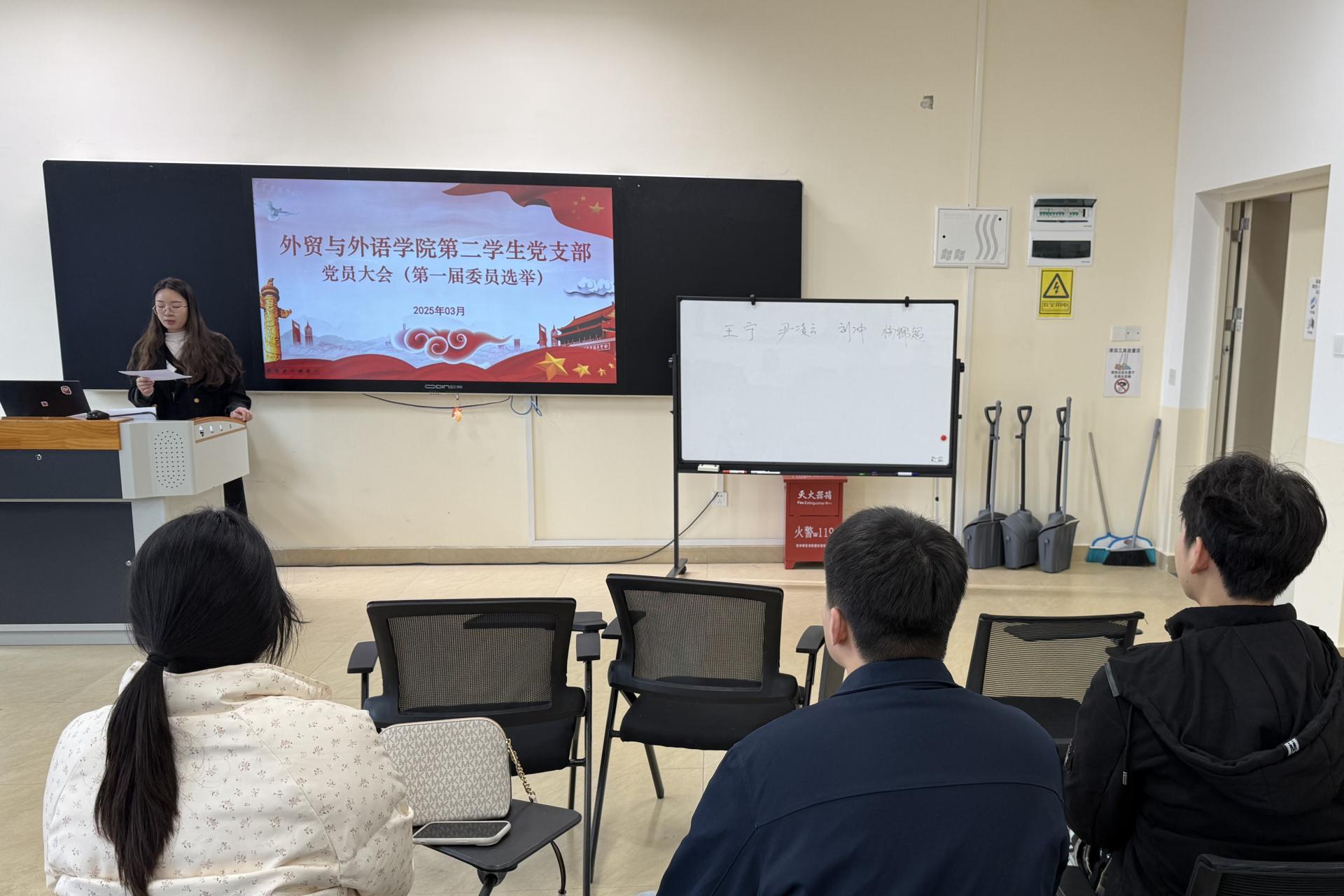3月7日,外贸与外语学院第二学生党支部于博文楼 F216召开党员大会。此次会议旨在选举产生新一届支部委员会,不断强化学生党支部的组织建设,为党建工作高质量发展注入强劲动力。会议由尹凌云同志主持。