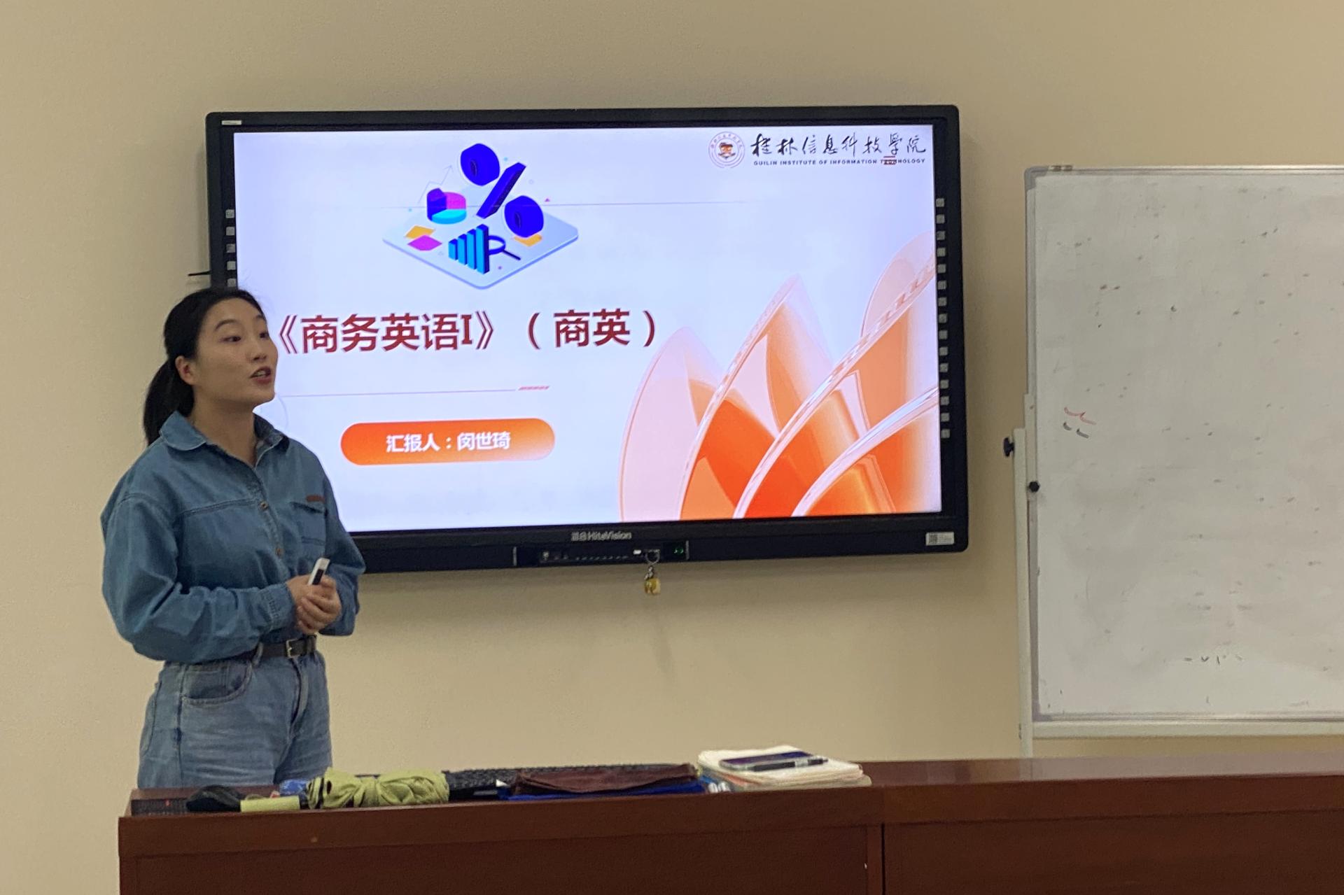 在本次活动中,专业带头人袁斌业教授就商务英语专业建设情况与特色进行了分享,冯文雄和闵世琦两位老师先后做了说课分享。袁斌业教授就商务英语专业的建设历程、建设成果、专业特色及持续改进做了全面的分享。冯文雄老师介绍了《商务英语翻译》课程的培养目标、课程定位、课程实施情况、教学方法与手段的创新等。冯老师重点介绍了该课程如何贯彻OBE(Object-Based Education,成果导向教育)教学理念,如组织学生前往桂林景区进行翻译现状的调研。闵世琦老师从课程基本情况、课程改革与创新、课程教学反思三个方面介绍了《商务英语》课程。其中在促进课程的改革与创新方面,闵老师采用了Jigsaw教学法,以提高学生小组合作的学习效果。在场教师认真学习了本次教研室的“六说”内容,并就两位老师的课程设计亮点和现存问题展开讨论,提出意见和建议。