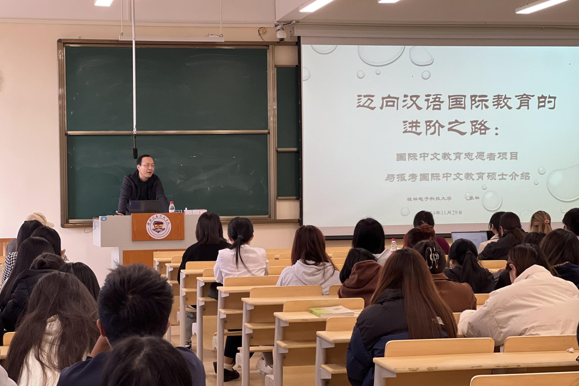 为进一步提升英语专业师生对国际中文教育事业的认知,外贸与外语学院于11月29日在敏思楼D207教室成功举办《孔院教师的使命与素养》和《迈向汉语国际教育的进阶之路》专题讲座。讲座由外贸与外语学院院长王家年教授主持,特邀桂林电子科技大学秦恺教授与张林教授为主讲嘉宾,英语专业教研室全体教师、2021级申报国际中文教育志愿者的学生、2022级及2024级英语专业学生参加。