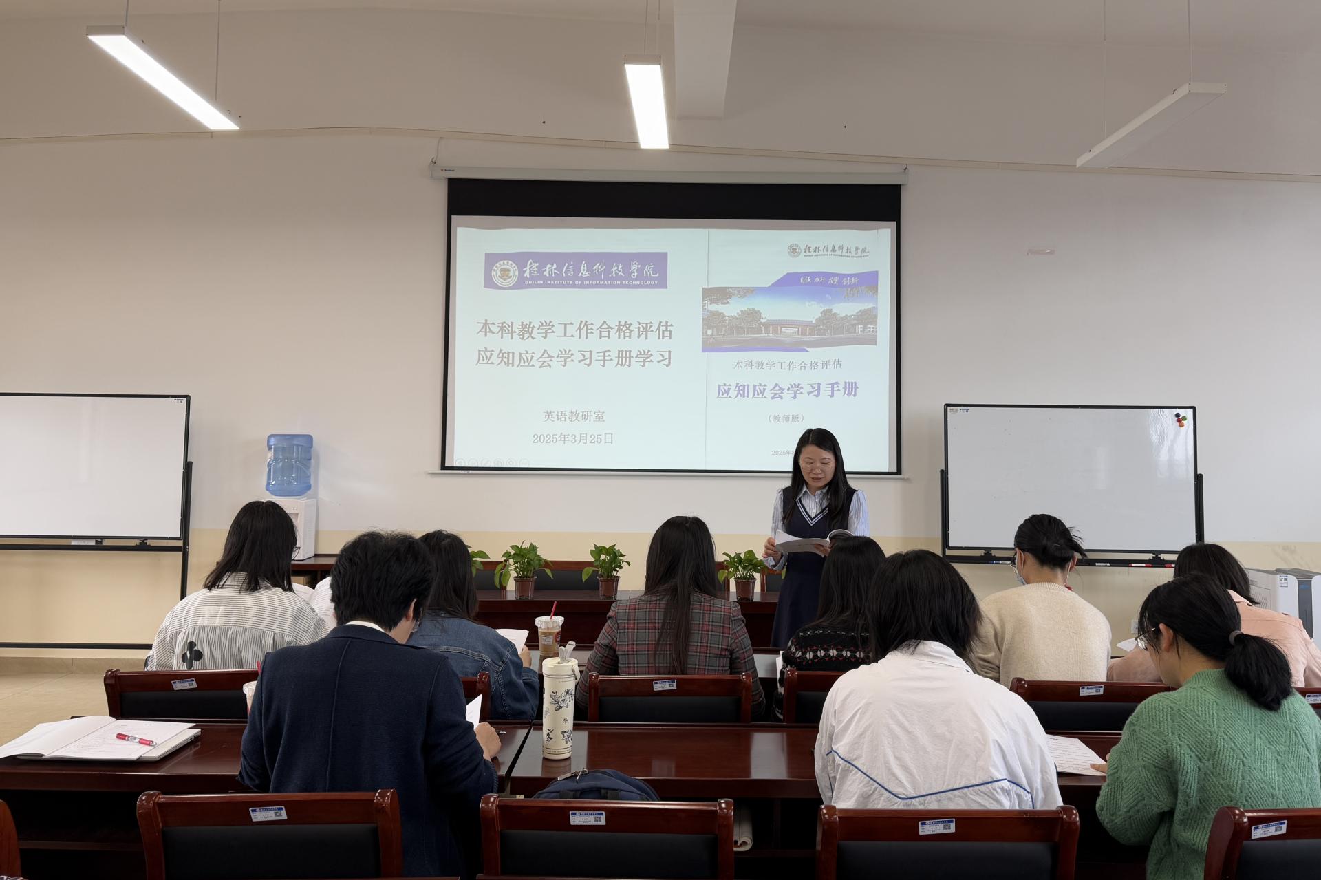 3月25日下午,英语教研室在F512会议室召开《本科教学工作合格评估应知应会学习手册(教师版)》研读会。会议由教研室主任王雪利老师主持并作详细讲解。
