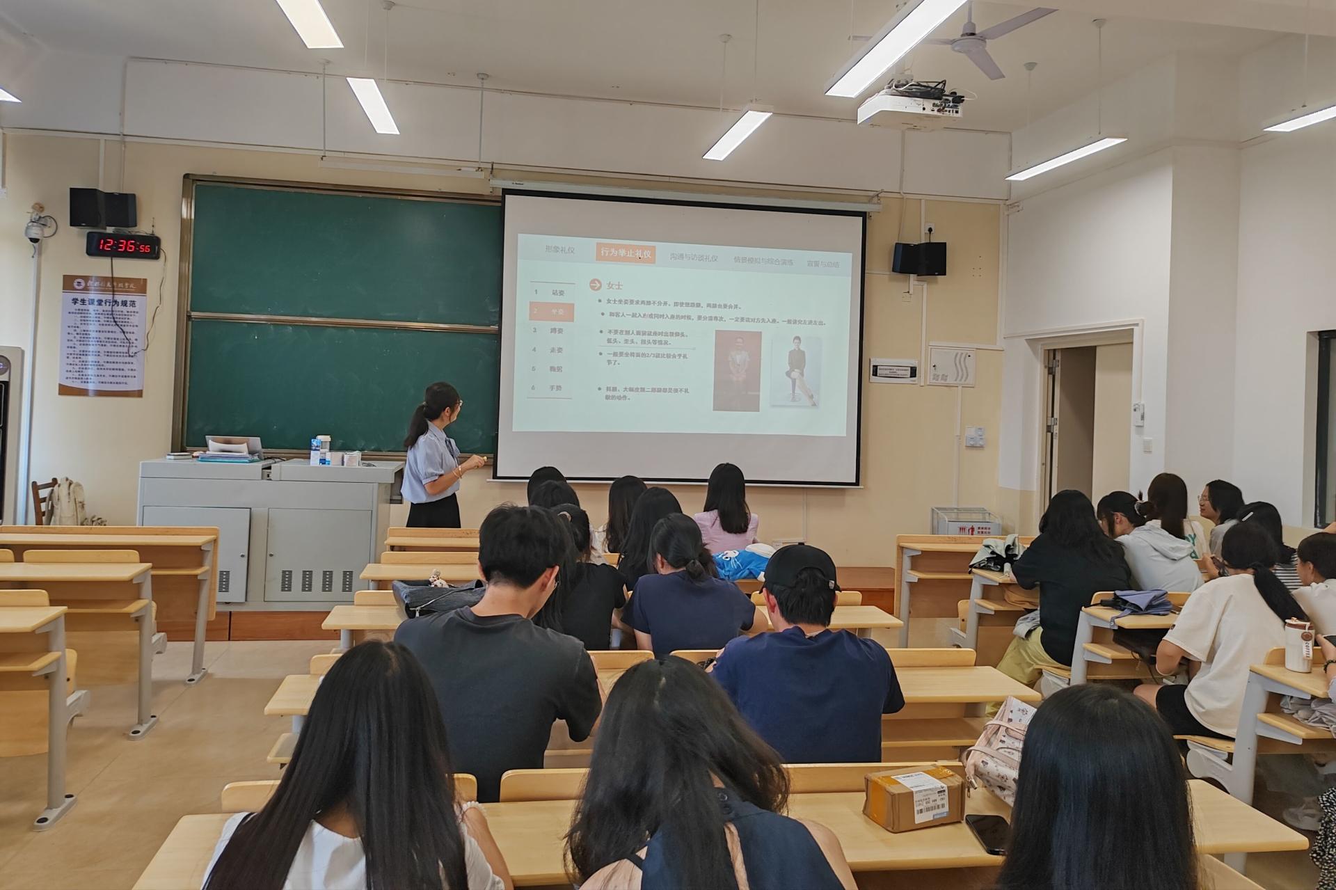本次班会分为“大学生课堂礼仪”与“展礼仪风采,树学子风范”两个部分进行:“大学生课堂礼仪”环节中,学业导师以“什么是课堂上的‘隐形尊重’”为切入点,通过情景模拟让学生直观感受文明行为的力量。学生们分组演绎“专注听讲不插话”“举手提问讲礼貌”“课前准备齐到位”等场景,将“尊重老师、遵守纪律、互助学习”的理念融入日常课堂。“展礼仪风采,树学子风范”环节则聚焦学生个人文明礼仪行为,分为“形象礼仪”“行为举止礼仪”“沟通与访谈礼仪”“情景模拟与综合演练”和“宣誓与总结”等五个部分进行,各环节层层递进:从整理着装、规范站姿塑造良好形象,到学习沟通话术、模拟访谈场景,最后全体学生宣誓践行礼仪,以庄重承诺为班会画上圆满句号。