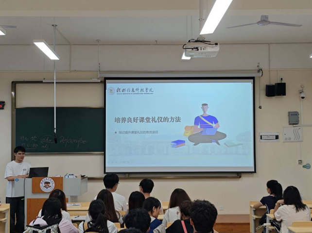 9月25日,外贸与外语学院24563103班在D211教室召开大学生课堂礼仪主题班会,本次班会由学业导师朱文凯主持,全体同学参加。