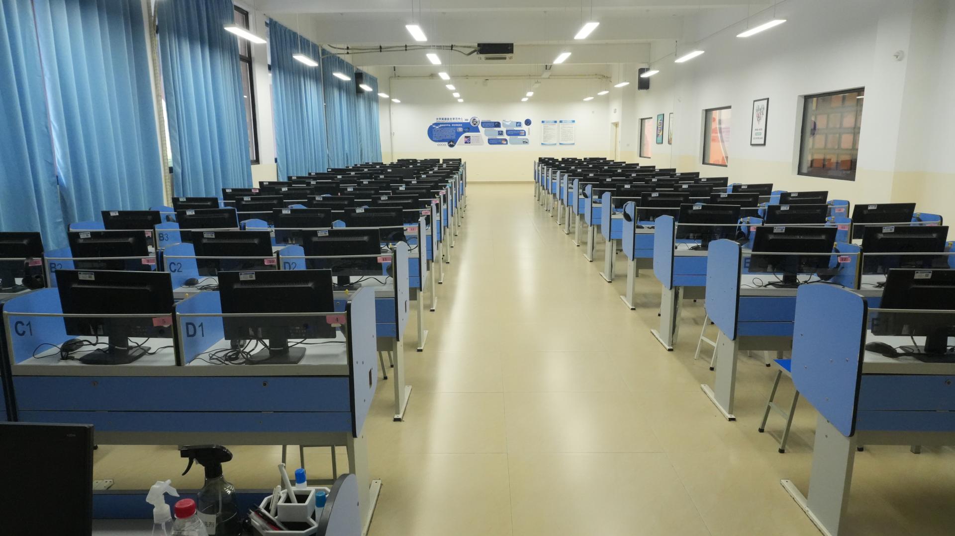 大学英语学习中心Ⅴ安装了蓝鸽云网络语言学习系统、FiF口语训练系统、外语外贸智慧教学平台等相关软件,承担《大学英语》《大学日语》视听说等课程教学任务。中心拥有90多个机位,可实施有组织的网络教学及网络考试,也可供学生利用课余时间进行自主学习。自主学习的环境,让学生朝着主动性、创造性、互动性、个性化学习的方向发展,提升学生学习英语的兴趣,鼓励学生成为学习的主体,有效地利用校园网、互联网获取学习支持和信息服务,自主选择认知工具,确定学习目标和学习内容,控制和调整学习任务和进度,主动探究学习过程,实现有意义的知识建构。
