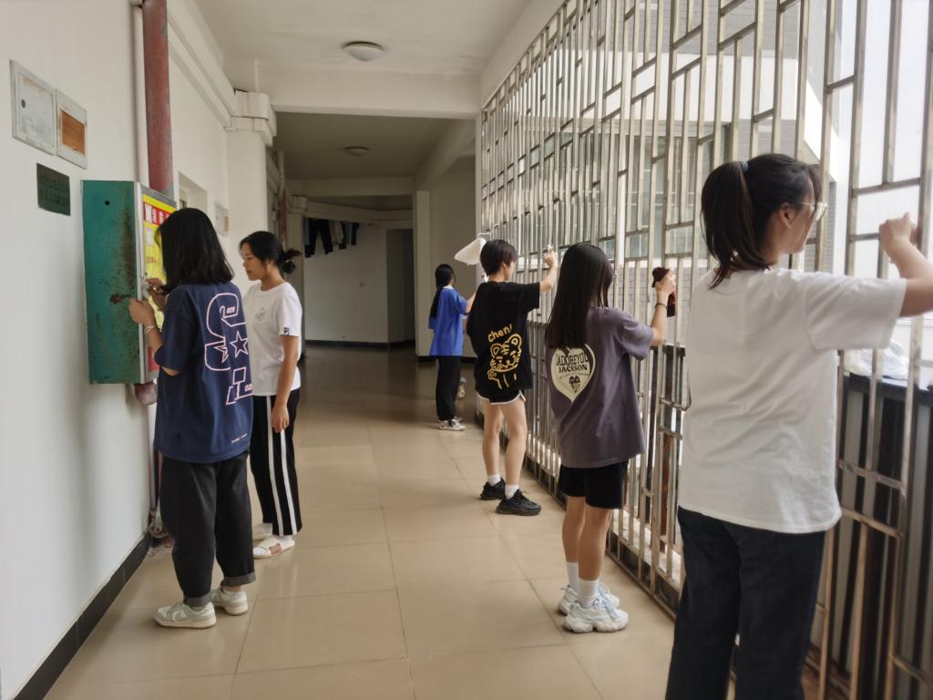在生活指导老师的带领下,同学们手持工具分工合作默契配合,充分发扬不怕脏、不怕累的服务奉献精神,清扫垃圾、蜘蛛网、擦拭楼梯扶手、宣传栏、捡拾落叶等,在忙碌中深刻体验保洁阿姨们工作的辛劳。在大家的共同努力下,学生公寓内外环境焕然一新。