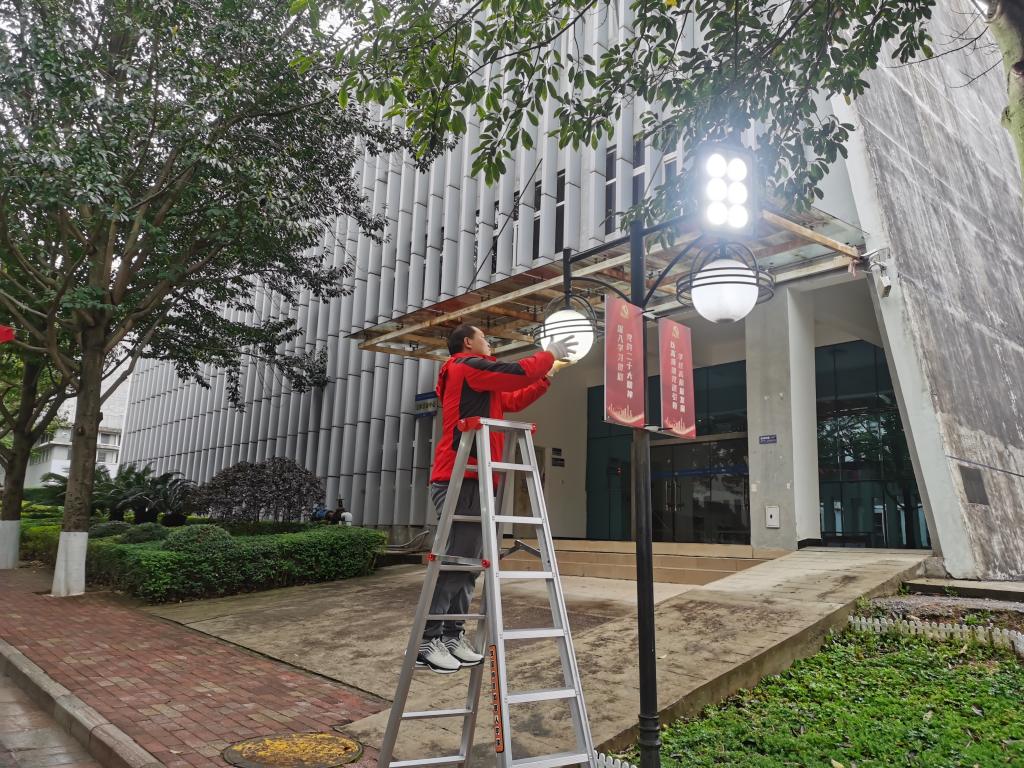 维修人员对校内电梯、中央空调、供电系统、供水管网、热水机组、变压器等进行了全面检修、保养,2月10日起,公寓全天18个小时热水供应;对全校路灯进行检修,确保师生夜间行路安全;为保证食堂正常开餐,提前进行设备维护和保养、线路检修;保证全校水通电亮的正常运转;督促校园商铺备货上架和设备检测,检查商铺货品质量和商铺卫生,有效了营造和谐良好的购物环境。
