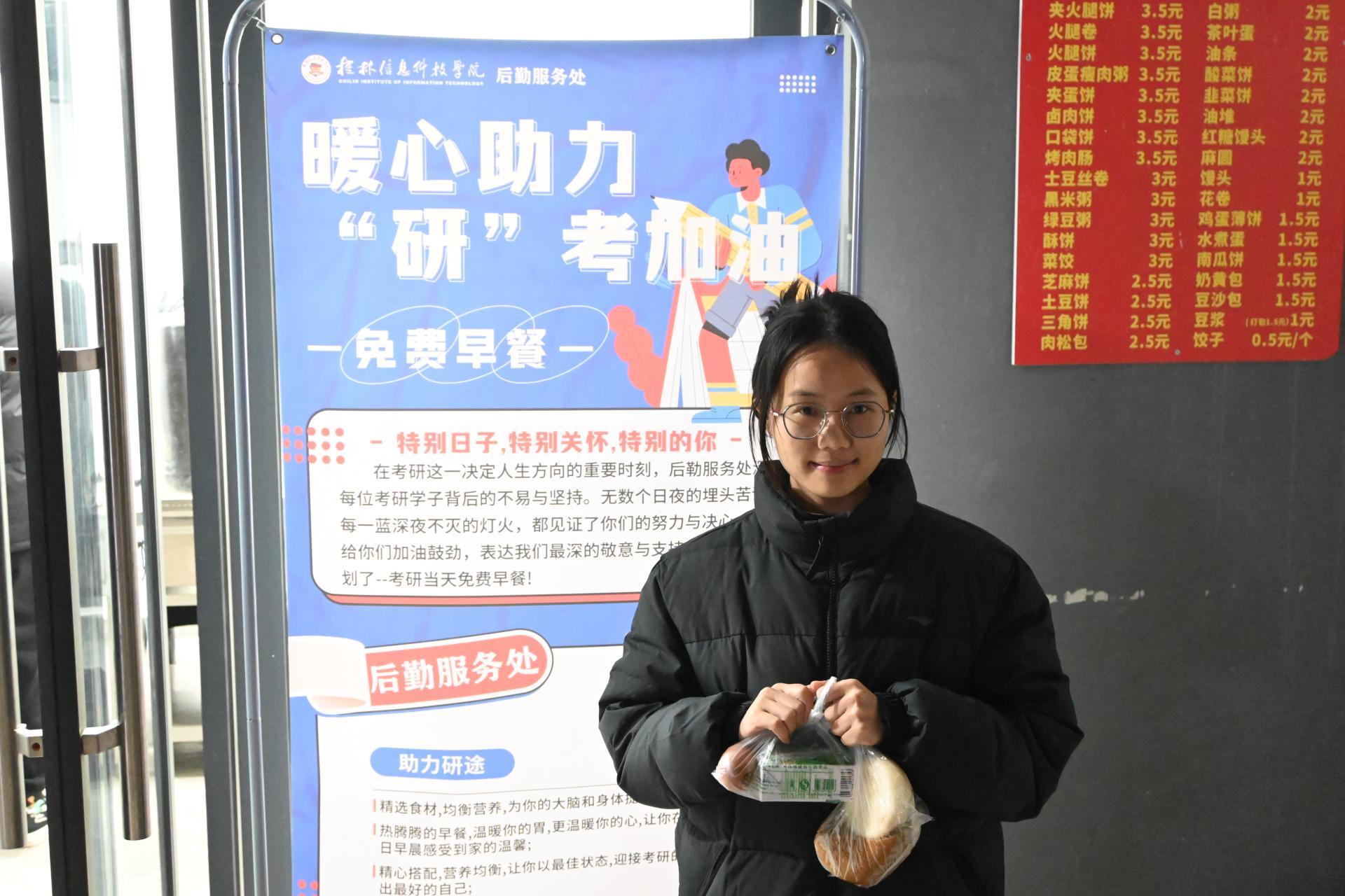 12月21日至22日,2024年全国硕士研究生招生考试开考,为给信科考研学子加油鼓劲,后勤服务处推出“暖心助力,‘研’考加油”免费早餐活动。