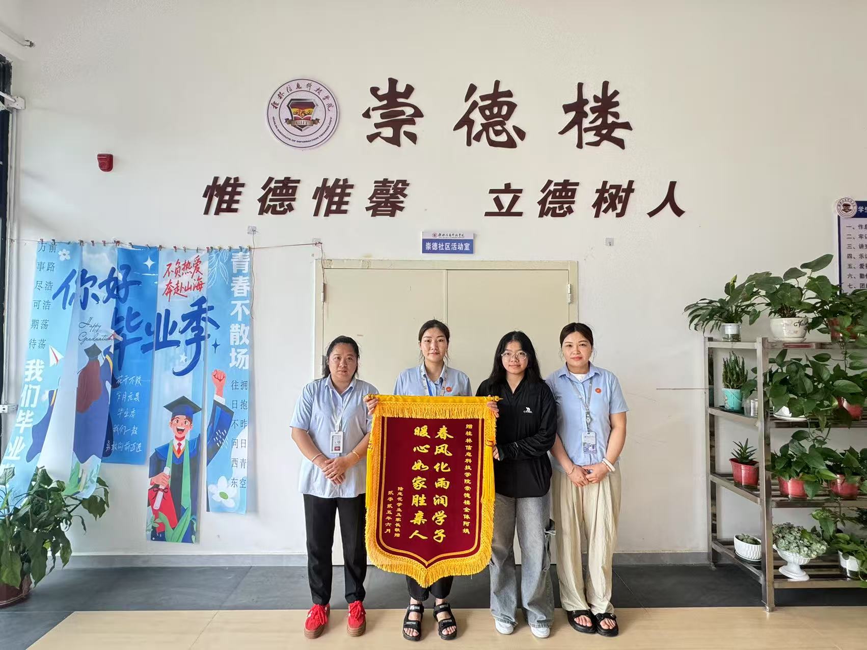 近日,后勤服务处收到多位毕业生代表赠送的4面锦旗,学生以锦旗的方式,向后勤工作人员表达四年来服务保障的感激之情。锦旗上“温情守护如母心暖四季,细致关怀似春常驻公寓”,“春风化雨润学子,暖心如家胜亲人”的赠语,是广大毕业学子对后勤服务的充分肯定和切身感受,也是对今后后勤保障的鼓励和鞭策,更是后勤育人实践“开花结果”的集中体现。