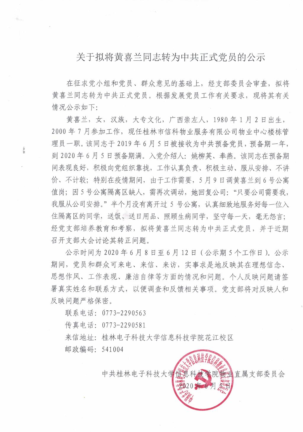 关于拟将黄喜兰同志转为中共正式党员的公示