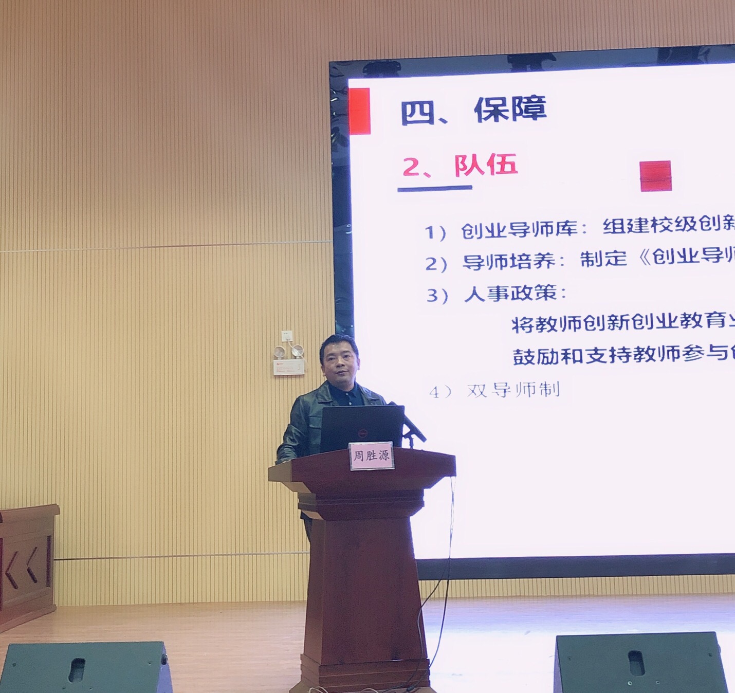 近日, 学院创新创业教育系列专题讲座在51206报告厅开讲,学院副院长、创新创业学院常务副院长周胜源教授以“创新创业教育的初心、使命、实践”为主题进行授课。学院招生就业部、教务科技部、学生工作部(团委)等部门负责人,各系主任、副主任、党总支书记,各系创新创业项目团队指导老师及学生300余人参加。培训由创新创业学院办公室主任、招生就业部部长陈丽军主持。
