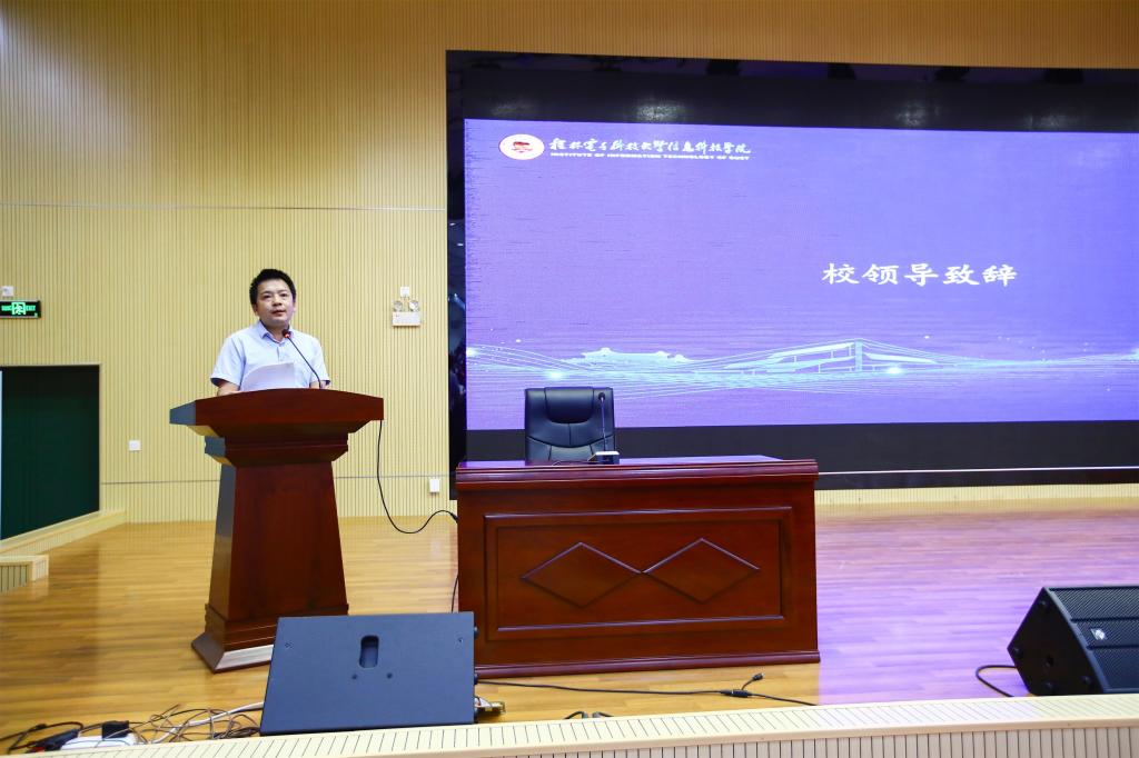 仪式上,副院长周胜源受院长段复建委托,对学院历年来参加五届中国“互联网+”大学生创新创业大赛的工作进行总结,对我院师生的参与情况予以了肯定。他指出:近三年来学院“双创”教育工作取得了进展,一是“双创”教育指导更有力度,成立创新创业学院,加强教师创新创业教育教学能力建设;二是 “双创”教育普及更有广度,不仅发掘教师资源,还聘请行业优秀人才充实我院双创指导教师队伍;三是初步建立创新创业课程、导师队伍、创新创业基地、创新创业部门结合为一体的双创生态系统。他强调:各系部要共同实施并保障学院参加“互联网+”大赛各级赛事的组织与管理工作,打好学院在创新创业教育的双创大战,把举办“互联网+”大赛作为我们转型升级发展的关键抓手,真正做到以赛促学,以赛促教,以赛促创。他表示:希望相关部门强化担当作为、创新方式方法,推动形成院、系部联动共推的机制,确保各项工作落到实处,齐心协力组织好本次大赛;希望广大学生把握机会积极参赛,在创新创业中增长智慧才干,把激昂的青春梦融入伟大的中国梦,努力成长为德才兼备的有为青年,奋力书写“我敢闯、我会创”的新篇章。