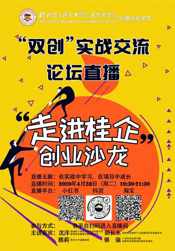 为了进一步做好创新创业学院“双创”教学及交流工作,创新创业学院邀请管理系沈洋老师、桂林广西优食客食品有限公司胡长水常务副会长、上海岚瑟服装设计有限公司陈莉总经理以及桂林市海内外高端人才创业创新示范基地负责人郭强开展“走进桂企”创业沙龙暨桂电信科“双创”实战交流论坛直播,现将有关安排通知如下: