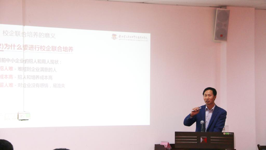 最后,段院长指出,学院在校企联合培养方面会提供“三步”保障机制:一、进一步加强领导,为校企联合培养提供有力的组织保证;二、进一步加强规范,积极推进校企契约式联合培养;三、进一步强化校企联动,推动校企深度合作。段校长强调,学校会继续继续深化产教融合,推进校企合作,实施“质量立校、特色兴校、人才强校、依法治校”发展战略,走特色化、差异化和内涵式发展道路,相信在企业代表的支持和共同参与下,学院的校企联合培养工作能取得更大的成功。