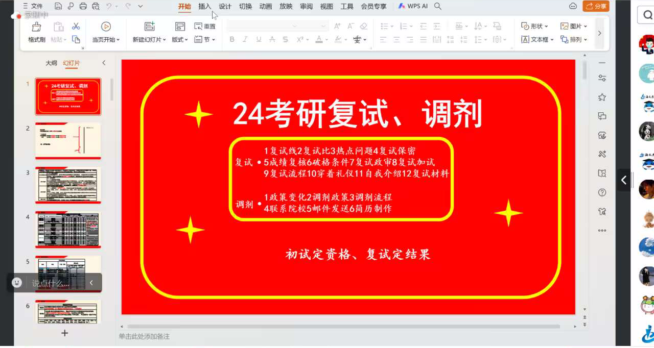 培训会采用腾讯会议的形式进行,确保了师生间的互动与交流的便捷性。陈大白老师以他丰富的考研辅导经验和深入的教育洞察力,为同学们详细解读了当前考研复试的形势、复试技巧、调剂事项、面试礼仪、心理准备等多个方面,让同学们受益匪浅。针对考生最关心的面试环节,陈老师详细介绍了面试的评分标准、常见问题及应对策略。他强调了复试中除了专业知识的重要性外,个人综合素质和面试技巧同样不容忽视。