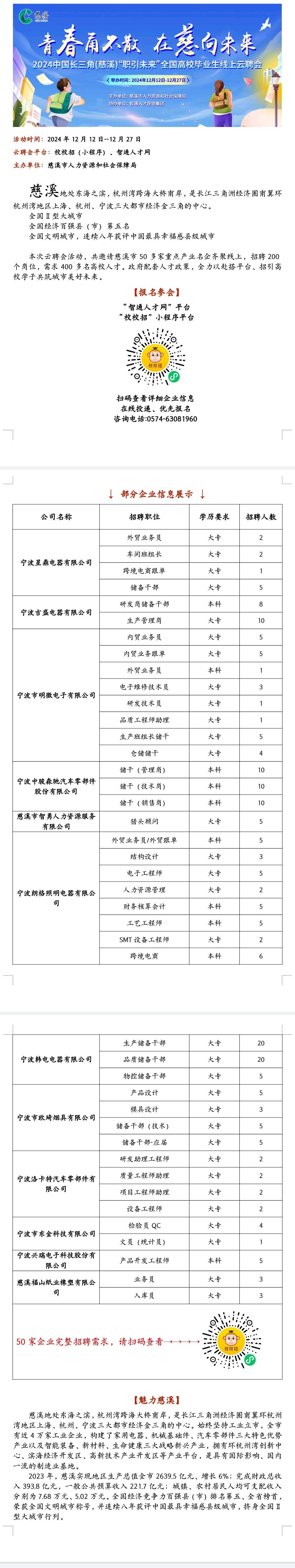 【线上】2024 中国长三角(慈溪)“职引未来”全国高校毕业生云聘会,名企高薪等你来应聘!