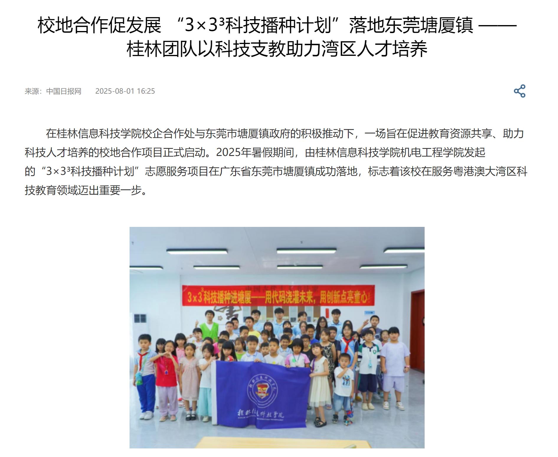 中国日报网链接:校地合作促发展 “3×3³科技播种计划”落地东莞塘厦镇 ——桂林团队以科技支教助力湾区人才培养