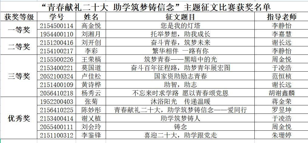 喜迎党的二十大,进一步推进学生资助政策宣传工作,beat365官网组织学生开展“青春献礼二十大,助学筑梦铸信念”资助主题征文比赛。各学院学生积极参加,经学院选拔,共收到推荐作品50篇,经校内评审,共评选出一等奖作品2篇,二等奖作品2篇,三等奖作品5篇,优秀奖作品5篇。