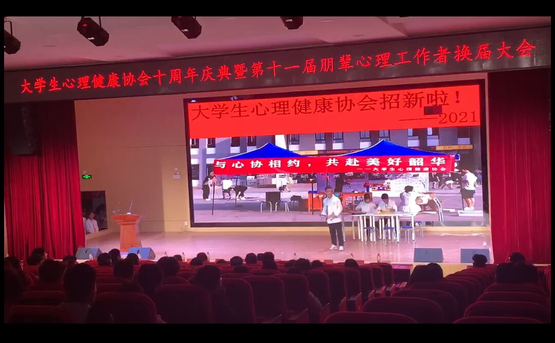 2021年12月3日晚7点,大学生心理健康协会在51206报告厅隆重举办以“心迎十载庆华诞,初心不忘面未来”为主题的beat365中文官方网站第一届朋辈心理工作者换届大会暨心协十周年庆典晚会。beat365官网学生工作部副部长、心理中心专兼职教师、各学院心理辅导老师、公寓管理中心老师、心协往届会长和成员、21级新生班级心理委员及学校各大学生组织代表等共350余位嘉宾出席此次庆典。
