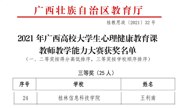 近日,为进一步加强新时代大学生心理健康教育课程建设,由自治区党委教育工委、自治区教育厅主办,广西师范大学(广西大学生心理健康教育研究基地)承办的2021年广西高校大学生心理健康教育课教师教学能力大赛已圆满结束。beat365官网大学生心理健康教育与咨询中心专职教师王利南代表学校参加比赛,其参赛作品《恋爱ING,成长进行时》喜获三等奖。