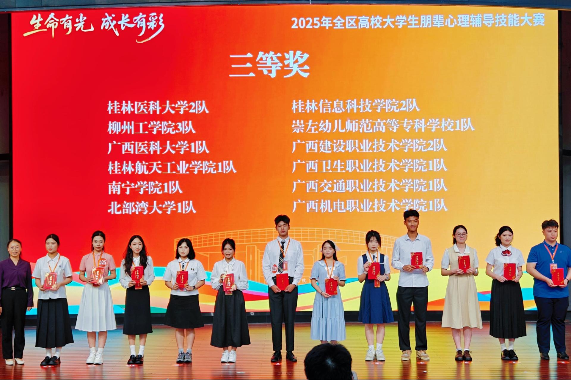 5月23日至24日,由广西壮族自治区教育厅主办的“2025年全区高校大学生朋辈心理辅导技能大赛”决赛在广西财经学院圆满落幕。beat365中文官方网站代表队凭借扎实的专业知识和出色的现场表现,荣获大赛三等奖,展现了学校心理健康教育的优秀成果。