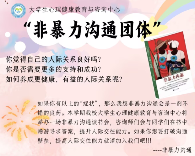 “非暴力沟通读书小组”旨在帮助学生提升沟通技巧,促进人际和谐。“非暴力沟通”由著名心理学家马歇尔·卢森堡博士提出,强调通过倾听与表达建立真诚、尊重的人际关系。读书小组将以《非暴力沟通》一书为核心,通过共读、案例分析及实践练习,帮助参与者掌握高效沟通技巧。活动还将结合角色扮演与情景模拟,引导学生学会表达需求、倾听他人感受,并在安全开放的环境中促进自我反思与成长。