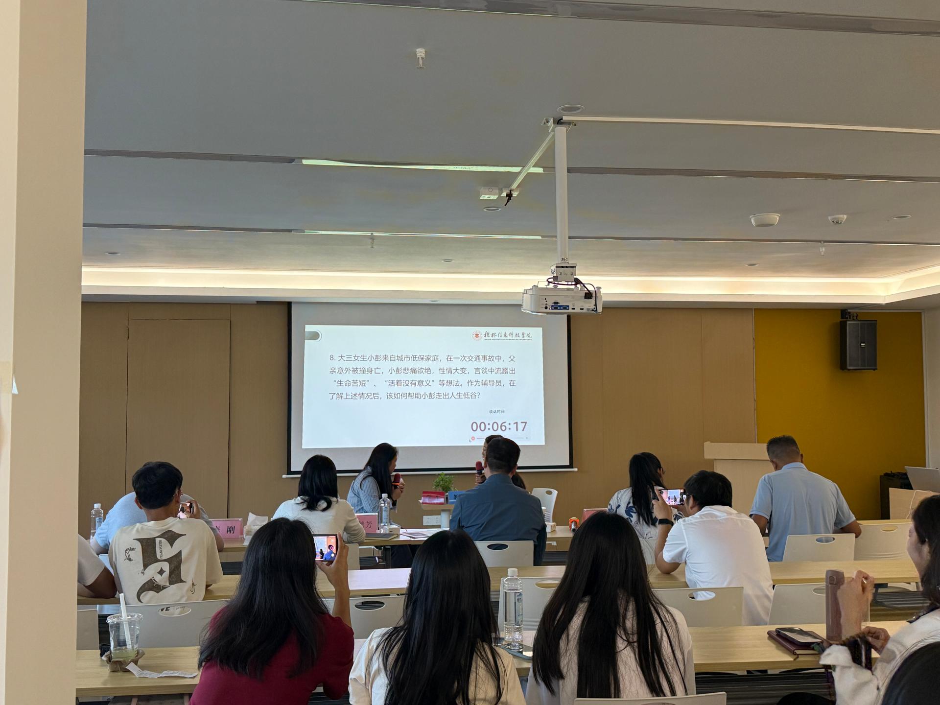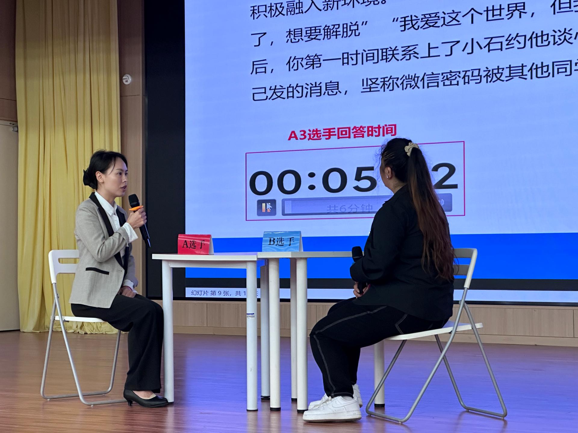 当日下午,谈心谈话环节备受瞩目,选手们与“学生”进行一对一深入交流,迅速洞察学生心理和问题关键所在,以亲和且富有感染力的沟通方式,引导学生逐步解决困惑,充分展现出出色的共情能力与教育引导技巧。谈心谈话结束后,紧接着进行身份识别环节,进一步考验辅导员们的观察与判断能力。