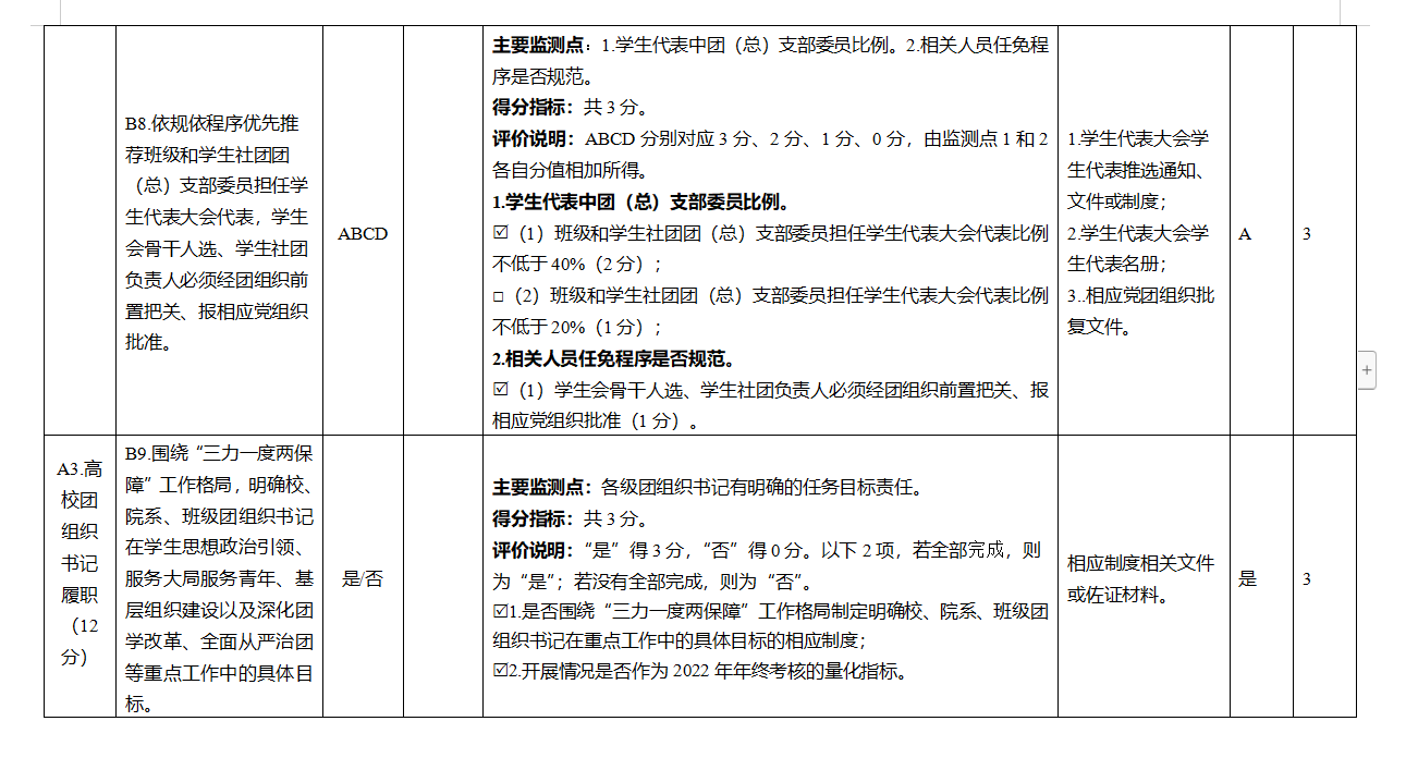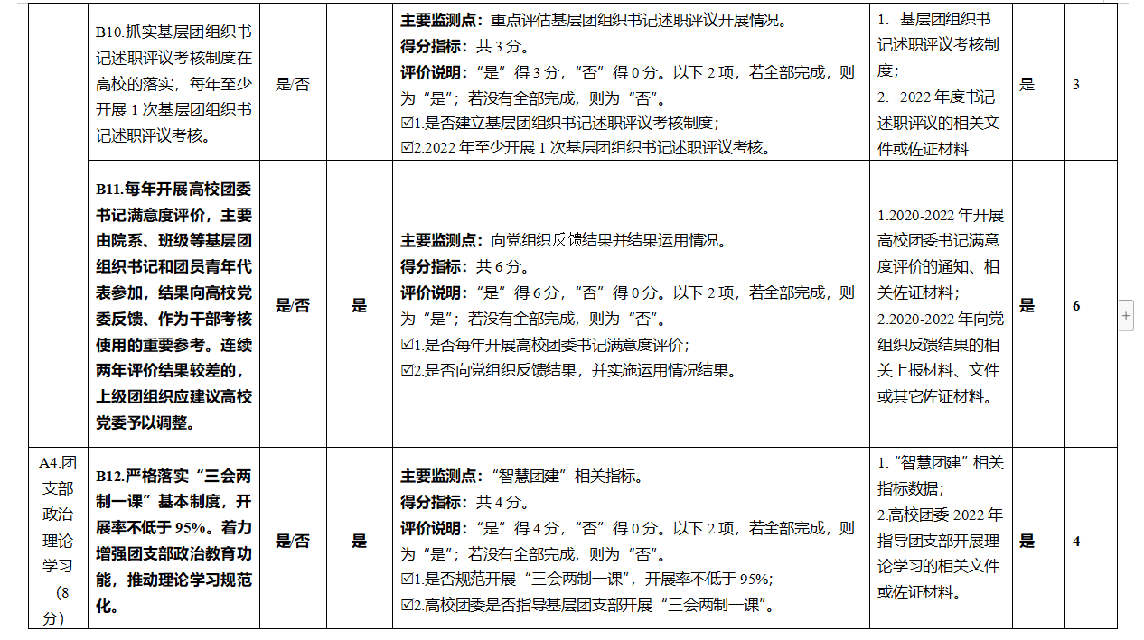 1.在责任落实方面。以“提升组织力、提升引领力、提升服务力、提升贡献度”四个维度工作质效为目标,强化“全面从严治团”“全面深化改革”政治保障,构建“三力一度两保障”考核评价体系,充分运用“三力一度两保障”考评成果,及时客观总结团组织书记的工作成绩和亮点、指出问题和不足。建立和抓实基层团组织书记述职评议考核制度,每年开展1次基层团组织书记述职评议考核,beat365官网2022年基层团组织书记述职评议考核将在12月下旬开展。