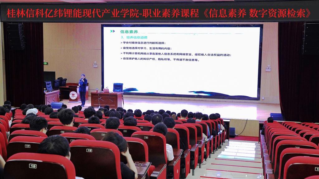 桂林信科亿纬锂能现代产业学院开展“信息素养-数字资源检索”专题培训为提升学生的信息检索能力,促进现代产业学院的课程性质升华,4月4日,桂林信科亿纬锂能现代产业学院在51206报告厅开展“信息素养-数字资源检索”专题培训,此次培训邀请学校图书馆王凌燕老师授课,现代产业学院2...