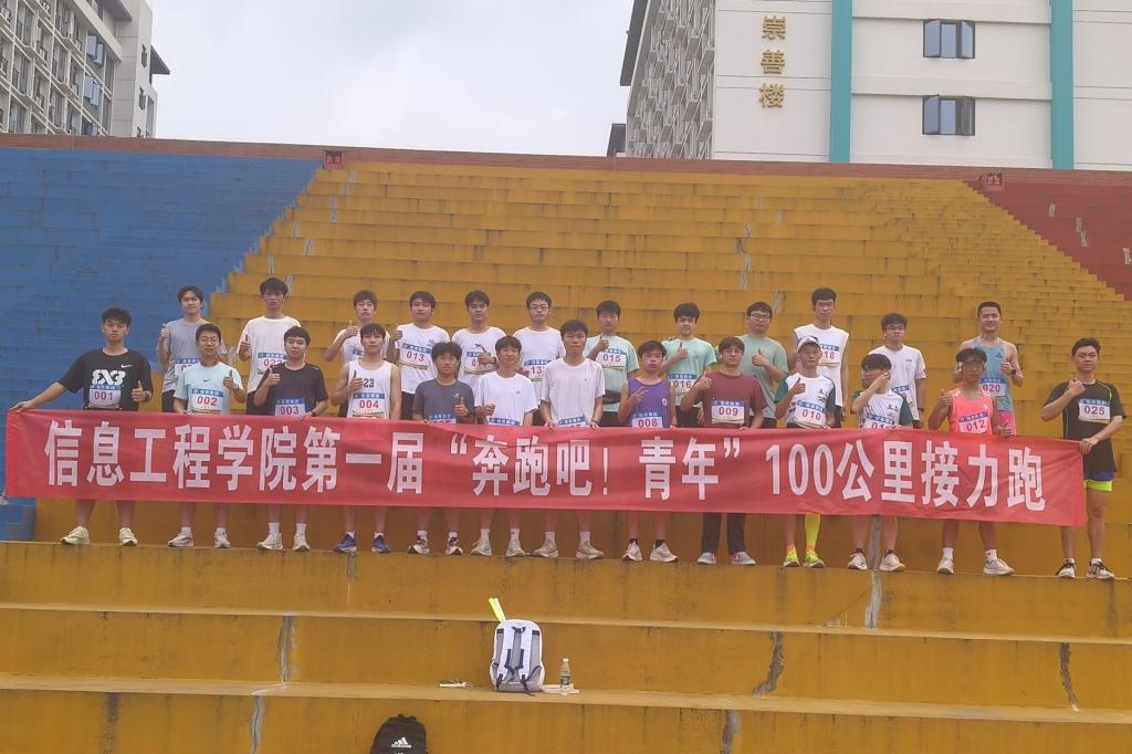 上午8:30,信息工程学院“信息青年”志愿者早早到达田径场,有序布置现场,9:20,活动正式开始,由信息跑团23级新生代表作为第一棒起跑。下午17:15由覃伟峰老师带领跑团成员完成最后一棒。本次接力活动共100公里,由20位成员历时8小时26分钟完成。通过成员们不懈努力,顶着烈日,相互鼓励,最终圆满完成了百公里接力跑活动。