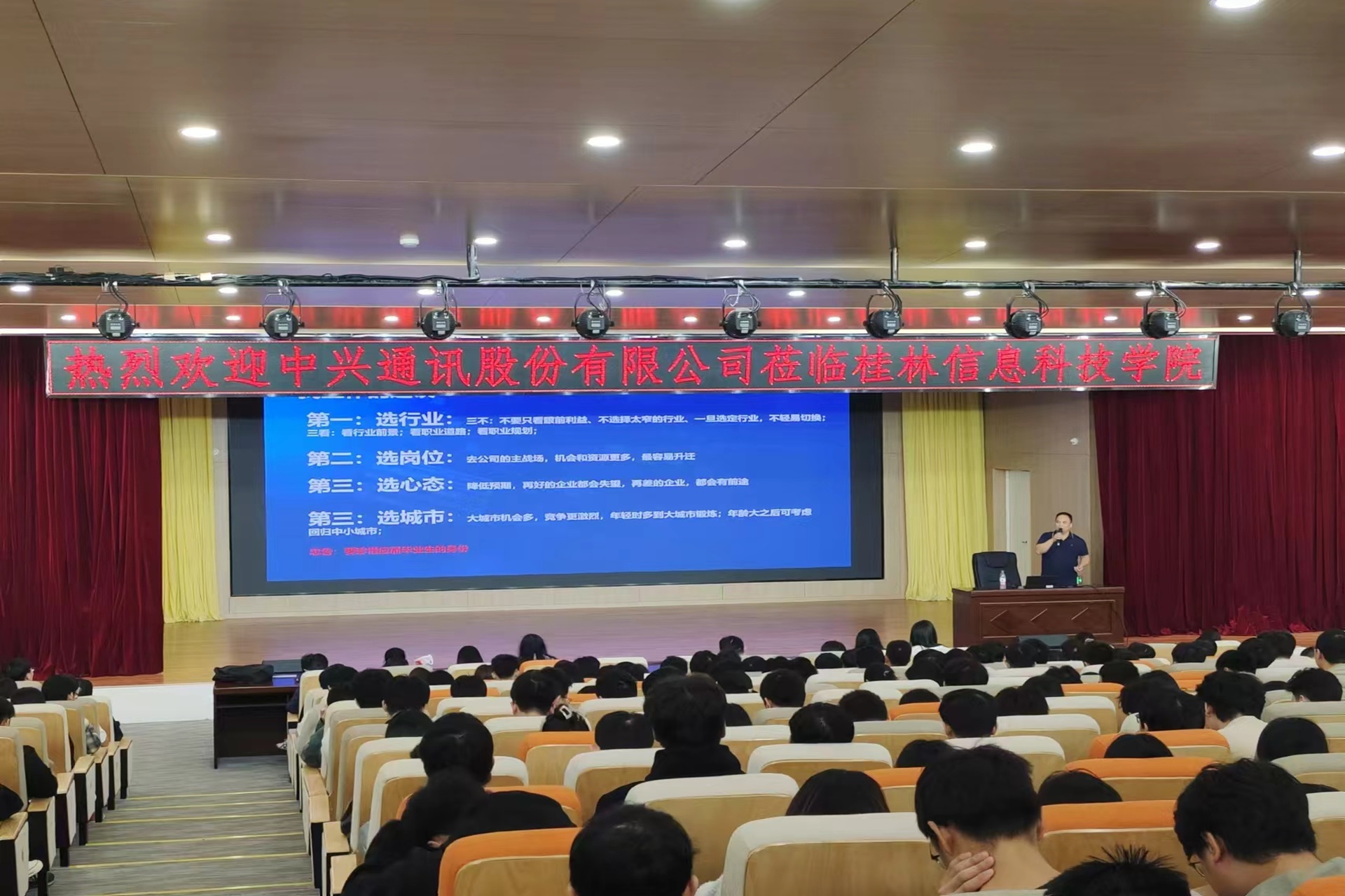 讲座中,李总从选行业、选岗位、选心态、选城市四个方向为同学们提出工作建议,详细讲解了当前行业的发展趋势、职位需求及所需技能,鼓励同学们要把握机遇,关注行业动态,提前做好就业准备。随后,李总详细解读了中兴通讯企业文化以及发展历程,并分享了企业真实招聘经验和职场故事,让同学们受益匪浅。
