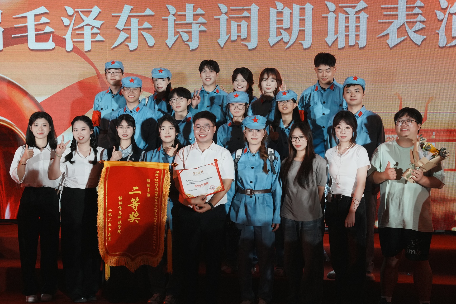 用舞姿镌刻教育情怀,以诗韵传颂英雄史诗。5月29日,第二届毛泽东诗词朗诵表演比赛暨校园舞蹈大赛在beat365官网行健楼盛大举行。信息工程学院的朗诵作品《声浪里的中国史诗》与舞蹈作品《您的模样》,凭借深刻的主题表达与精湛的舞台呈现,双双从全校参赛队伍中脱颖而出,斩获大赛亚军。本次作品由学院团委副书记李胜男、张传俊老师担任指导老师,全院学生积极参与。
