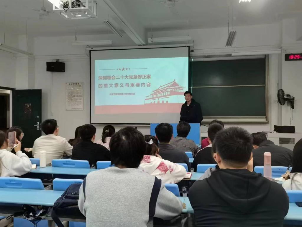 为深入学习宣传贯彻党的二十大精神,引导支部党员充分认识到《中国共产党章程》(以下简称《党章》)修订的重大意义,11月17日,信息工程学院第二学生党支部在31101以“深刻领会二十大党章修正案的重大意义与重要内容”为题,进行了支部理论学习大会,本次大会由我院第二学生党支部书记谢长远主持。