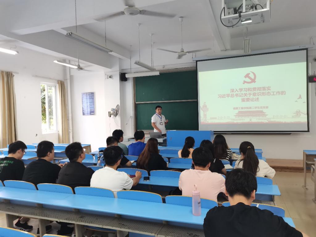 9月23日,信息工程学院第一、第二、第三学生党支部在31102教室开展理论学习,深入学习《党委(党组)意识形态工作责任制实施办法》和习近平总书记关于意识形态工作的重要论述等内容,本次会议由我院第二学生党支部书记谢长远主持,全体党员参与。
